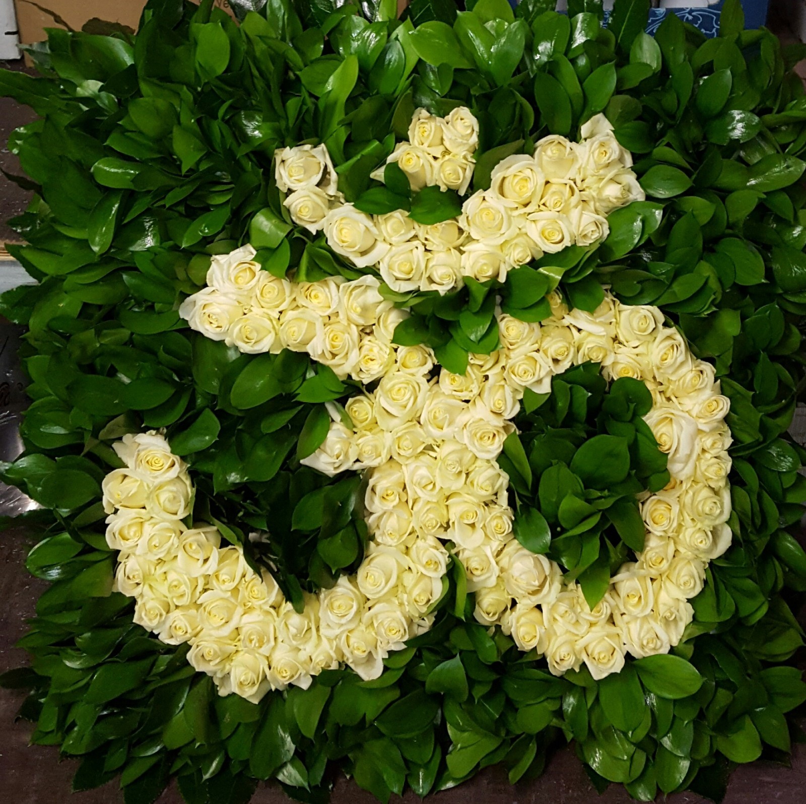 Ohm teken gemaakt van witte rozen met groen op een plaat van 90×90