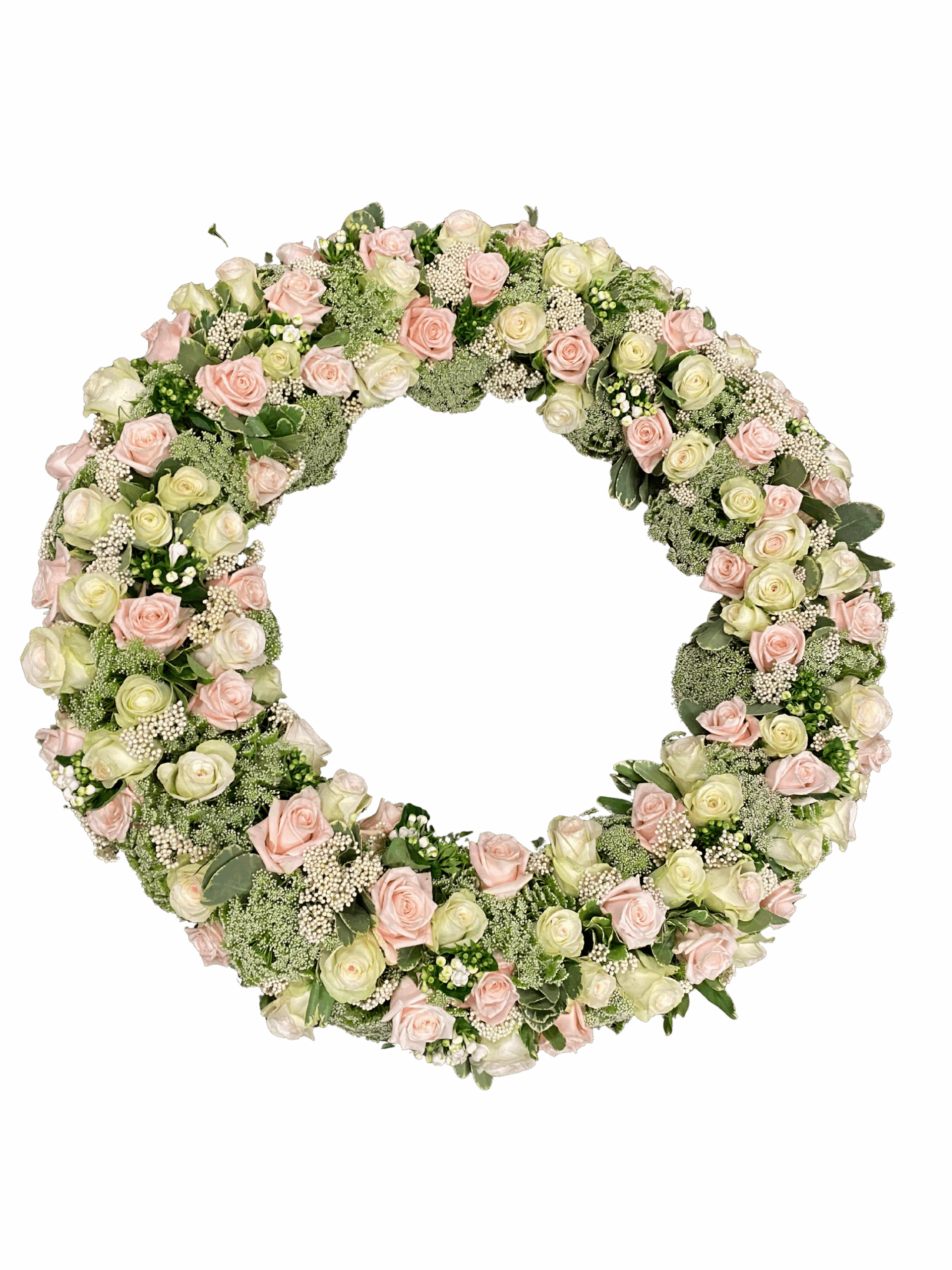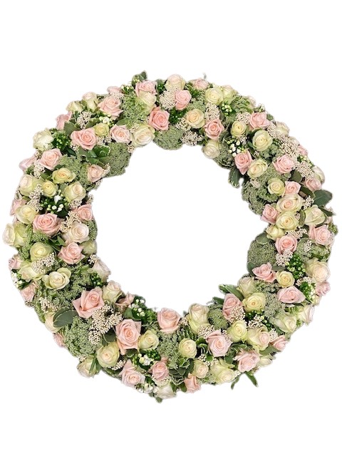 Mooie rouwkrans gemaakt van witte en zalm kleurige rozen afgewerkt met groen